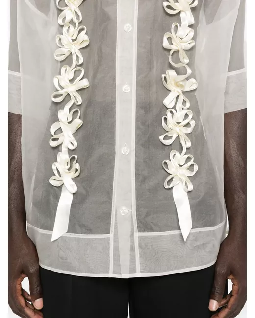 beige ribbon embellishment floral motif short sleeves front button fastening
