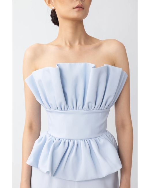 Crepe strapless top with a waist panel and ruffle feature. Pair with the Alex Pant