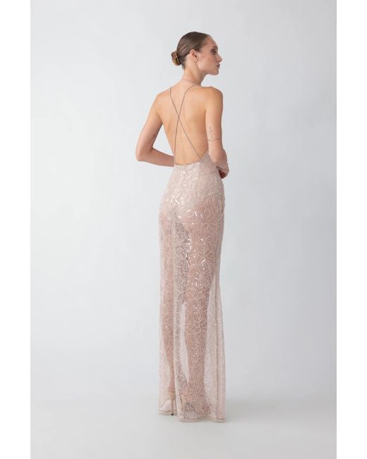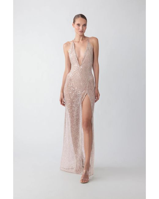Fully beaded backless maxi dress over a mesh bodysuit with a plunging neckline and a thigh-high slit