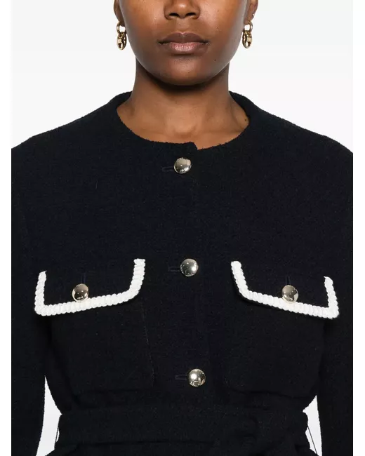navy blue tweed effect white braided-trim patch pockets button fastening self-tie belt