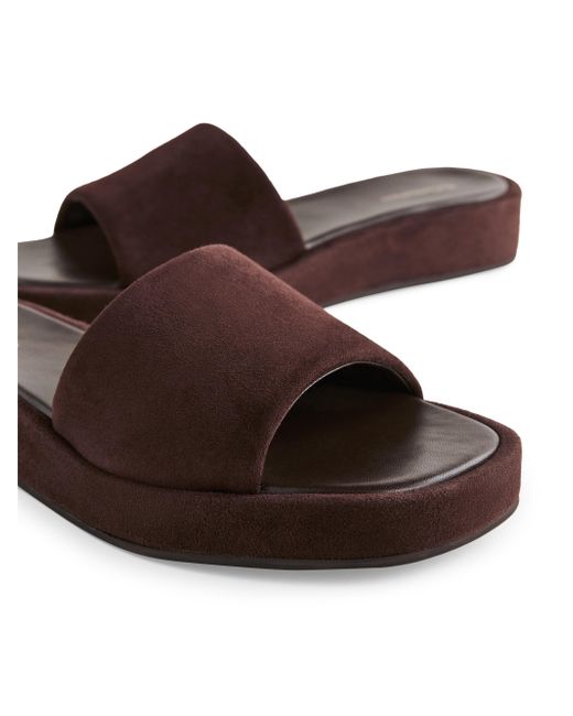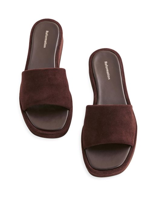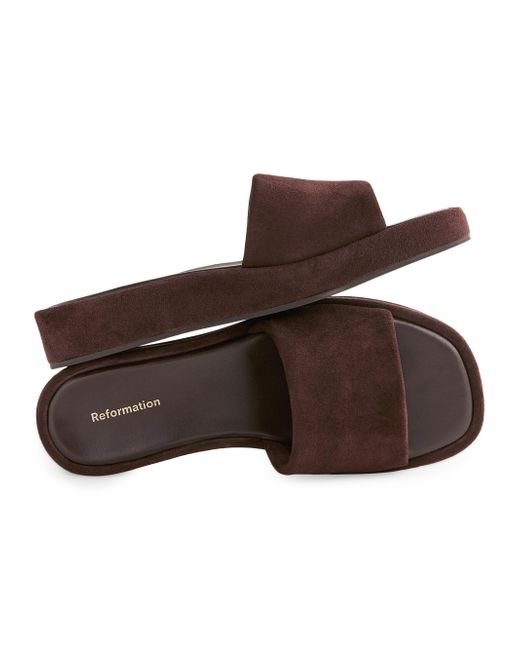 These Esme platform slides from Reformation are crafted of supple suede and feature an open toe, easy slide-on style, and signature logo print. Open toe Slides on Suede upper Leather lining Leather sole Imported SIZE Heel: about 1.4" (35mm). Women's Shoes - Workshop Shoes > Reformation > Saks Fifth Avenue. Reformation. Color: Espresso Suede. Size: 8.