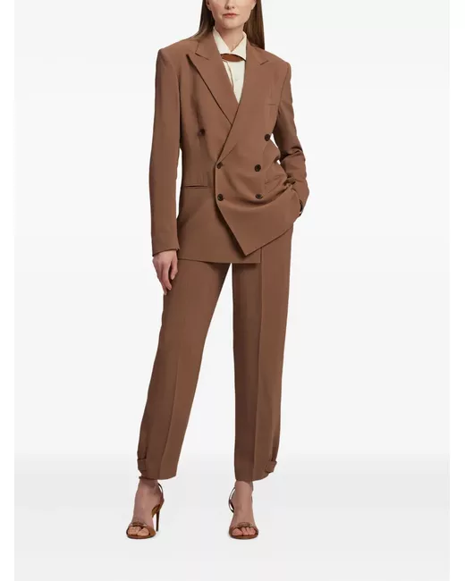 light toffee brown double-breasted closure button closure peak lapels structured shoulders welt pockets