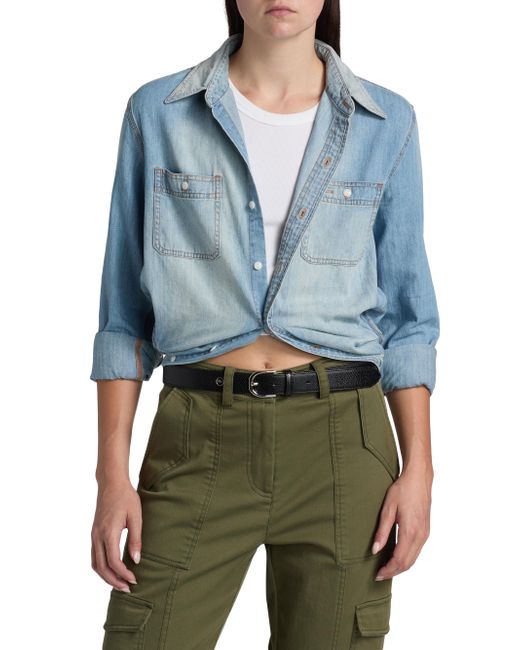 R13's Wrap-Around work shirt is crafted of cotton denim and features a unique wrap-around design with a button-front closure. Spread collar Long sleeves, button barrel cuffs Chest button-through patch pockets Elasticized hem Button-front closure 100% cotton Machine wash Imported SIZE & FIT About 26" from shoulder to hem Model measurements: 5'10" tall Model is wearing a US size Small. Contemporary Sportswear - Workshop > R13 > Saks Fifth Avenue. R13. Color: River Blue. Size: XS.
