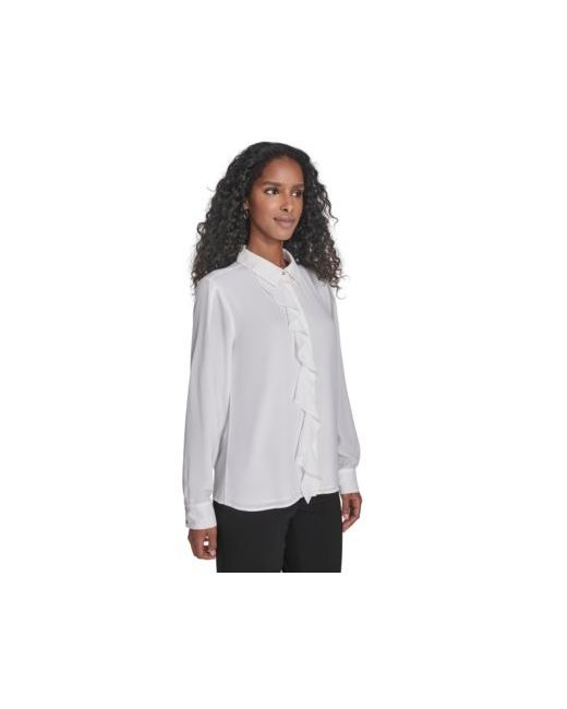 Simply elegant, this Calvin Klein blouse features a classic collared neckline, delicate ruffle detailing, and graceful long sleeves, offering a refined touch to any wardrobe.