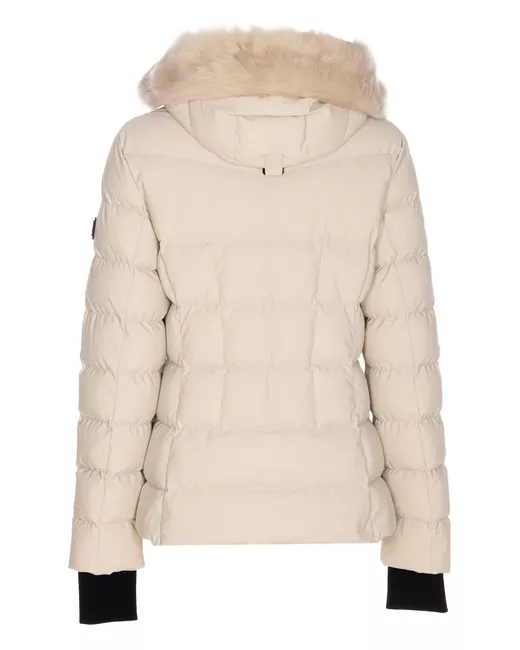 light beige duck down filling zip and snap-fit closure removable fur trim lateral logo patch quilted design