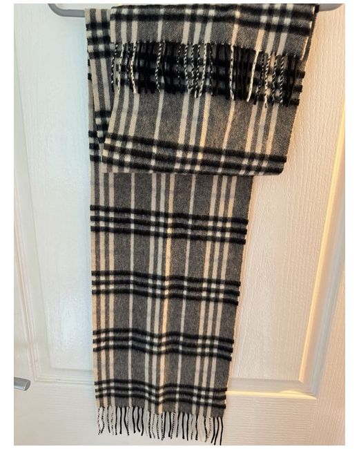 The Burberry Cashmere Scarf in the check pattern features a classic grey colour with fringe accents, making it a stylish and versatile accessory for both men and women. Crafted from luxurious cashmere and knit fabric, this rectangle scarf from the United Kingdom is perfect for keeping warm during the winter season. The Burberry brand and Nova character add a touch of sophistication to this must-have garment, which should be dry cleaned only to maintain its quality. Ideal for adding a touch of luxury to any outfit, this Burberry scarf is a timeless piece for any wardrobe.