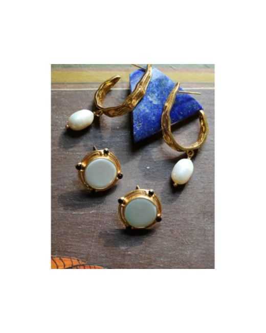 These statement earrings feature iridescent pearls suspended by an ally shaped gold hoop, finished with a stunning gold texture. Whether worn with a party outfit or a simple oversized knit, these contemporary, yet timeless earrings will get heads turning.21ct gold plated on brassear posts are plated on sterling silvernatural freshwater pearls