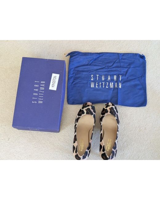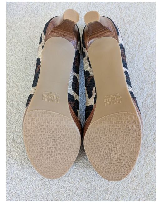 The product is a pair of Stuart Weitzman for Russell & Bromley high heel court shoes in size 7, featuring an open toe design and stiletto heel. The shoes are leopard print pattern and are made from fabric with an open toe. BNWOT with box and dust bag.
