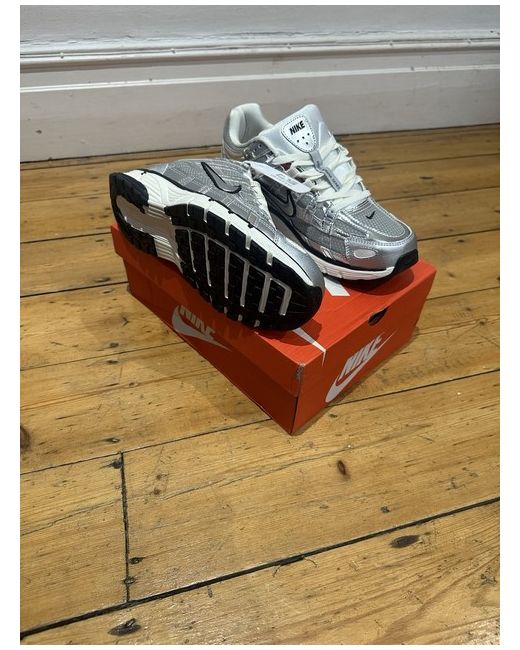 This is a Nike P6000 trainer in silver, designed for men. It is a size UK 10 and features a sleek sneaker style. The shoes are new and come in their original box.