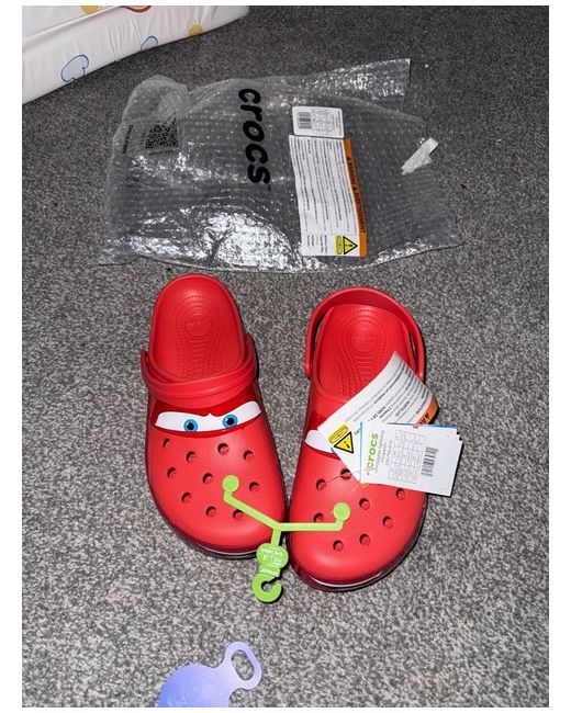 This product is a pair of brand new Crocs in men's size 9, featuring the popular character Lightning McQueen in a vibrant red colour. These casual shoes are perfect for fans of the Lightning McQueen character, adding a fun and playful touch to any outfit. Made by Crocs, these comfortable and durable shoes are a must-have for any casual wardrobe.