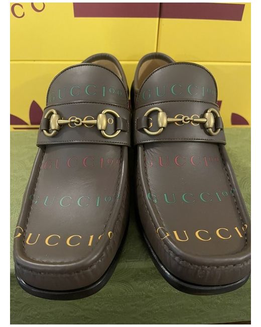 Celebrate the 100th anniversary of Gucci with these stunning horseshoe loafers. Crafted from high-quality leather, these brown oxford shoes are the perfect addition to any formal outfit. The size 6UK/7US shoes feature the iconic Gucci brand and are designed for men. These dress shoes are a must-have for any fashion-conscious individual who wants to make a statement. The Gucci Horseshoe 100th Anniversary Loafer is a limited edition shoe that is perfect for any formal occasion. It's a great investment for anyone who wants to add a touch of luxury to their wardrobe.