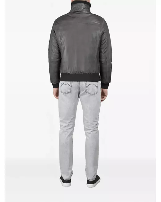 dark grey leather construction shearling collar zip fastening welt pockets ribbed hem and cuffs