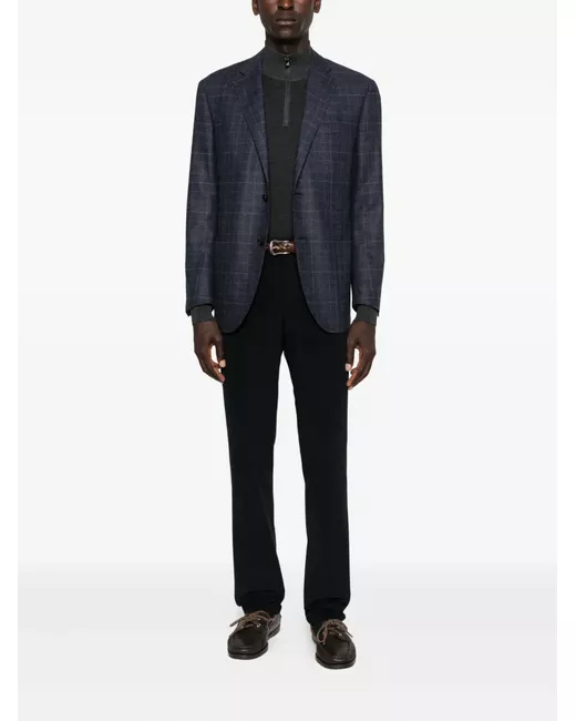 blue checked pattern two-buttons patch pockets notched lapels long sleeves