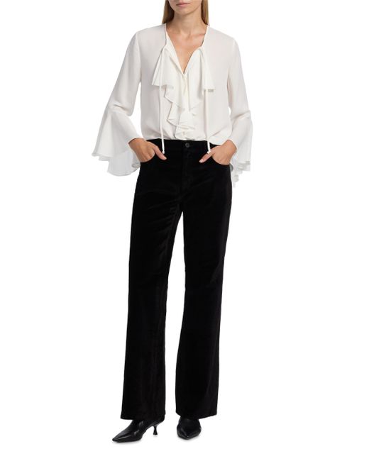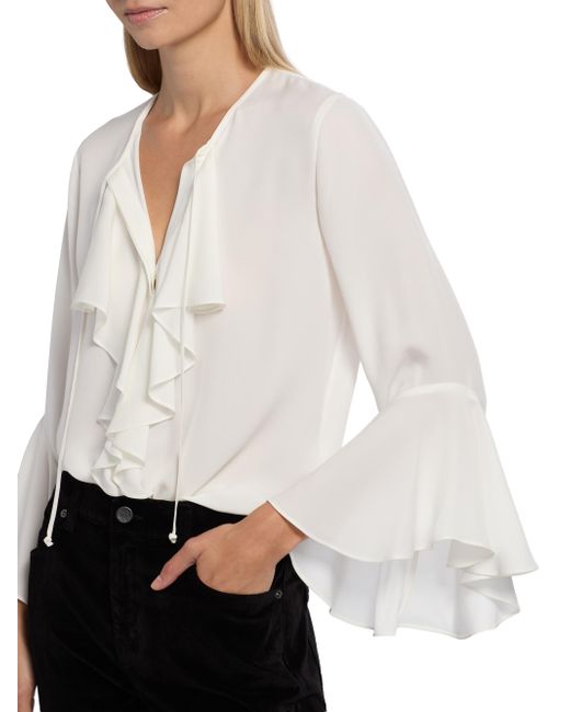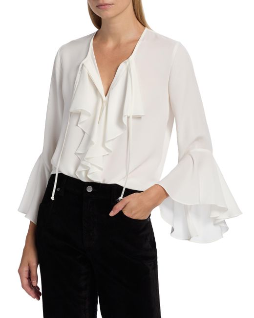 Crafted of luxurious silk, Kobi Halperin's Turner blouse cascades with a romantic front ruffle framed by draped bell sleeves. This piece features a tie-neck that can be worn closed as a crewneck or open as a V-neck. Tie-neck Long bell sleeves Concealed button-front closure 100% silk Dry clean Imported SIZE & FIT About 26.25" from shoulder to hem Model measurements: 5'10" tall Model is wearing a US size Small. Modern Collections - Kobi Halperin > Kobi Halperin > Saks Fifth Avenue. Kobi Halperin. Color: Ivory. Size: XS.