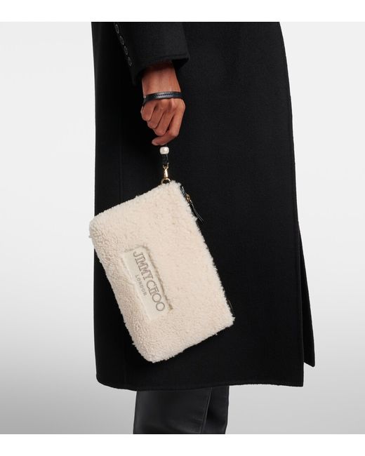 Material: shearling. Lining: fabric. Made in Italy. Designer color name: Natural/Black. Item color: white, black. Closure: zipped top. Wrist strap. Shearling.