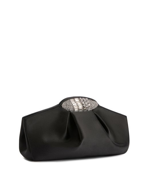 Silk clutch bag with snap fastening, jewel accessory with pavé-set crystals and inner leather strap.