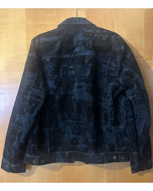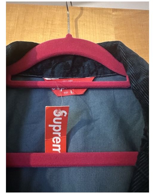 The Supreme Vibrations Corduroy Trucker Jacket in size large is a stylish and casual outerwear option for men. Made from cotton corduroy, this jacket features a blue colourway with the iconic Supreme branding. The regular fit and classic trucker style make it a versatile and on-trend addition to any wardrobe. Perfect for everyday wear, this jacket exudes a cool and effortless vibe, making it ideal for those who appreciate quality craftsmanship and modern design.