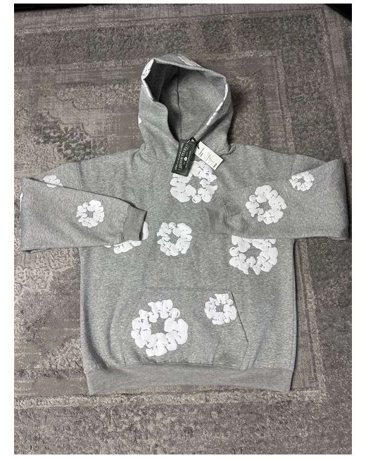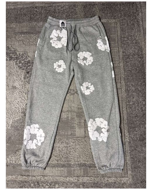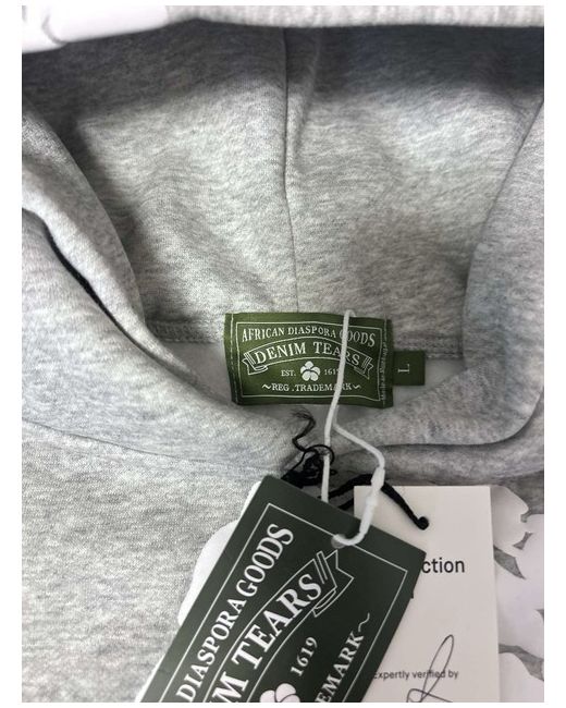The Denim Tears Grey Tracksuit is a stylish 2-piece set perfect for men who love activewear. Made from soft cotton denim in a grey colour, this tracksuit features a floral pattern, long sleeves, and a pullover closure for easy wearing. The set includes a hoodie with a logo accent, ideal for a casual yet fashionable look. Designed in the United States, this midweight tracksuit is machine washable and perfect for spring seasons. Introducing the denim tears brand, known for its unique blend of streetwear and high-end fashion.