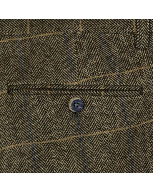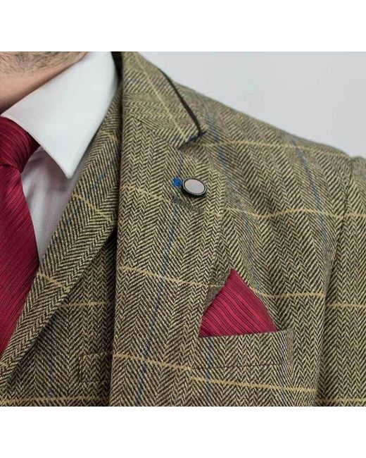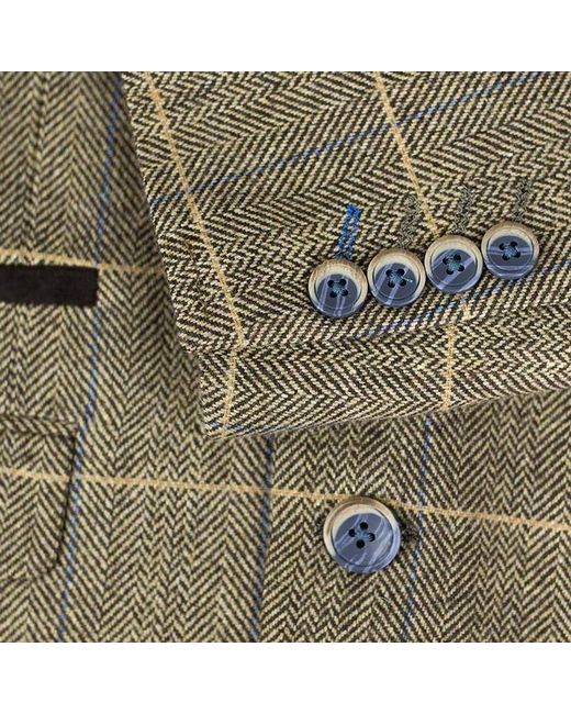 It also has a ticket pocket detail and a bold contrast lining. Brown tweed jacket with striking brown herringbone underneath a two-tone windowpane overcheck. 90% Poly/10% Wool. © Leonard Silver.