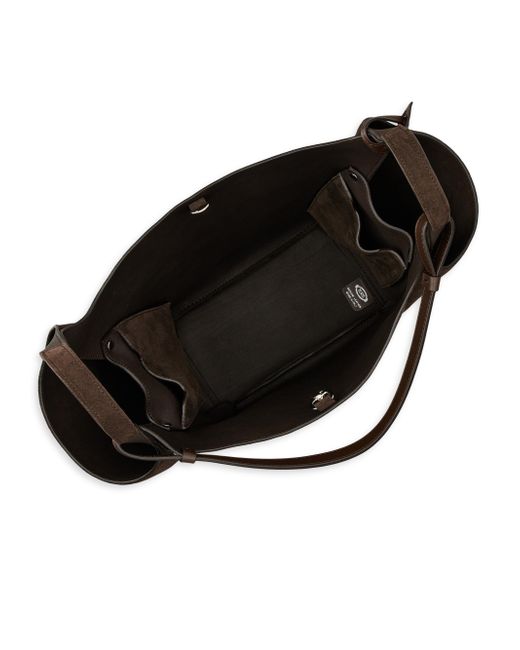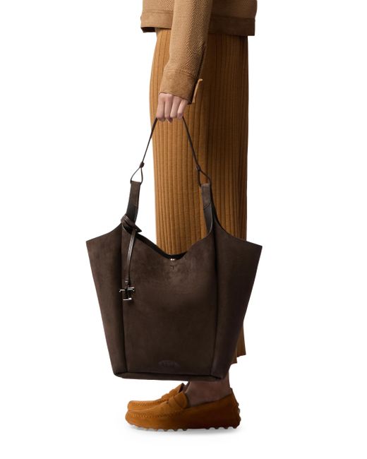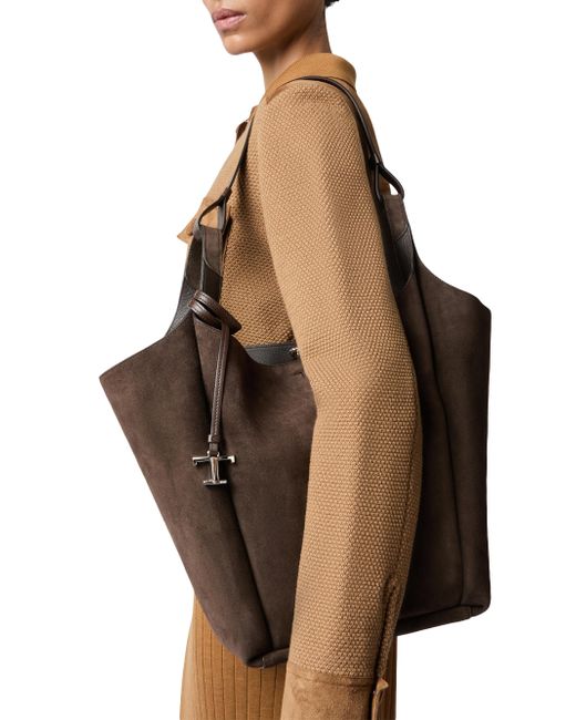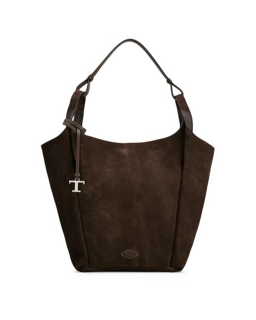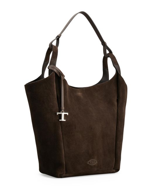 This medium bucket bag from Tod's is crafted of soft suede and features a trapeze shape with a flat handle, logo stamped on the front, and a T goldtone pendant. Top handle Interior: two flap pockets Protective metal feet Dust bag Snap-hook closure Suede Leather lining Made in Italy SIZE About 16.5"W x 13"H x 5"D. Handbags - Designer Handbag Multi > Tod's > Saks Fifth Avenue. Tod's. Color: Moro Marrone Africa.