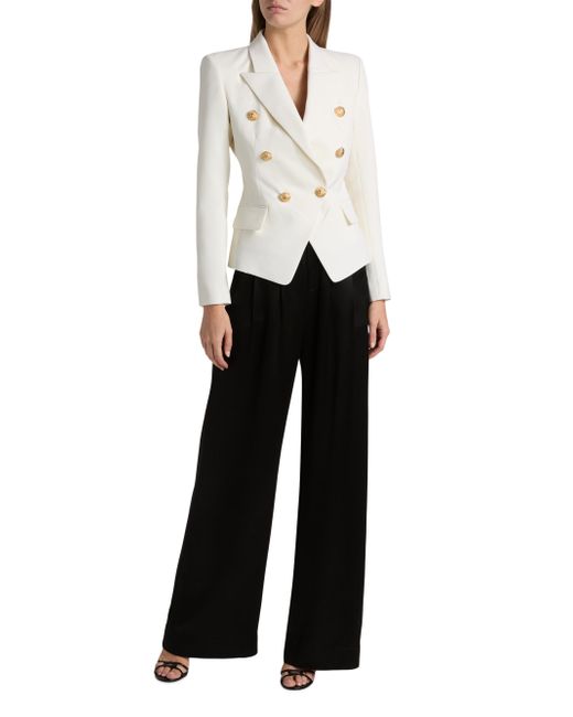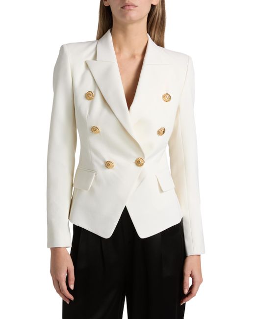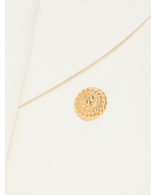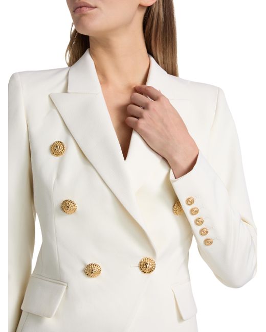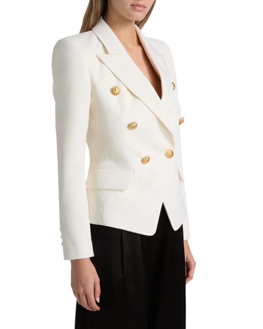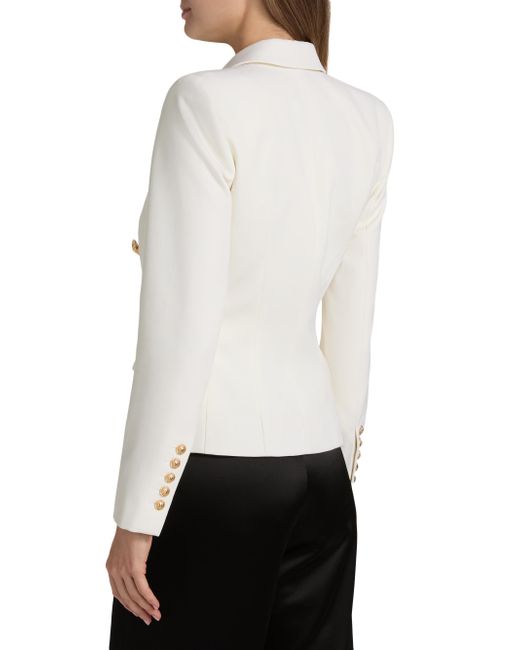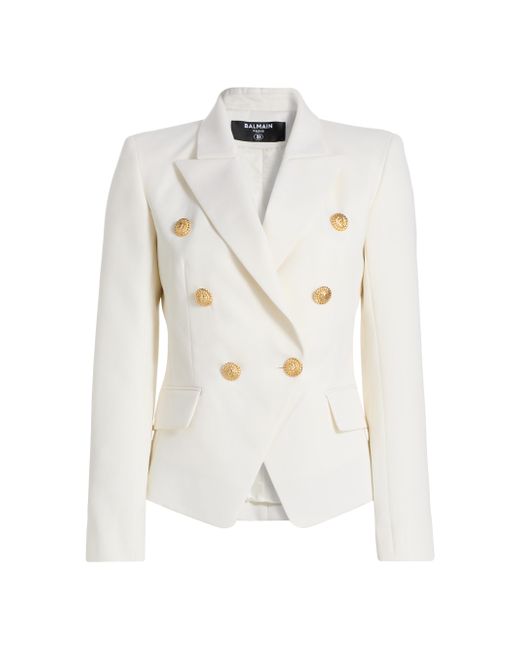 Balmain's wool jacket highlights the fitted silhouette with a sleek double-breasted design with engraved goldtone buttons. This piece features peak lapels and front flap pockets. Peak lapels Long sleeves, button cuffs Front flap pockets Double-breasted button-front closure 100% wool Dry clean Made in Portugal SIZE & FIT About 25" from shoulder to hem Bust: about 34" Waist: about 29.5" Model measurements: 5'10" tall Model is wearing a US size 4 ABOUT THE BRAND In 1945, founder Pierre Balmain made his well-received debut of opulent, ultra-feminine designs. Known today for its iconic blazers, impeccably constructed dresses and signature fragrances, the brand continues its dedication to masterful tailoring and elegance under the helm of Creative Director Olivier Rousteing. Advanced Designer - Balmain > Balmain > Saks Fifth Avenue. Balmain. Color: Ivory. Size: 2.
