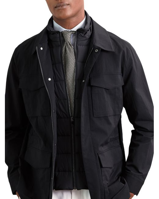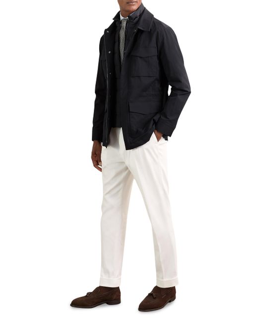 The Bryson Safari jacket from Reiss features a four-pocket design with an internal vest. This jacket is fully lined and includes a snap-button storm placket. Spread collar Long sleeves Four flap pockets Front zip closure, snap-button storm placket 96% polyamide/4% elastane Lining: 100% polyester Dry clean Imported SIZE & FIT About 30.25" from shoulder to hem Model measurements: 6'2" tall, 40" chest, 31" waist Model is wearing a US size Medium. Mens Modern Coll & Outer - Modern Collections > Reiss > Saks Fifth Avenue. Reiss. Color: Navy. Size: Small.