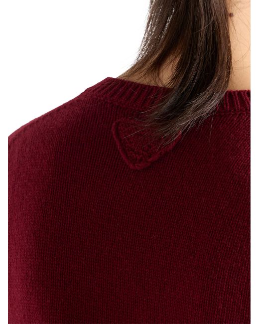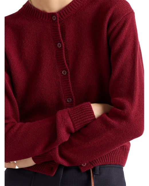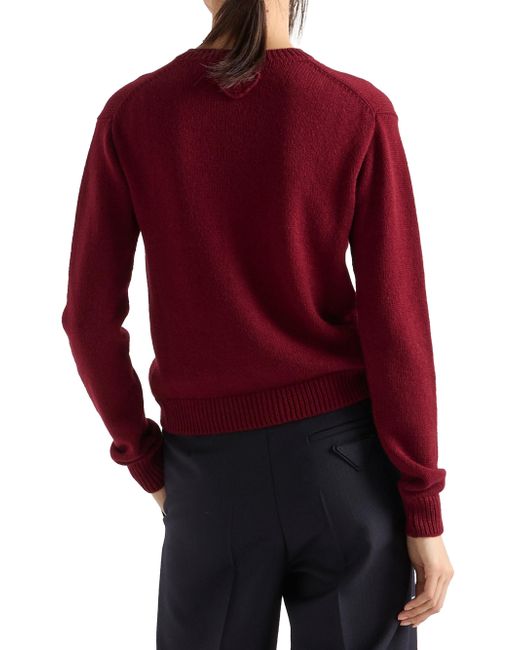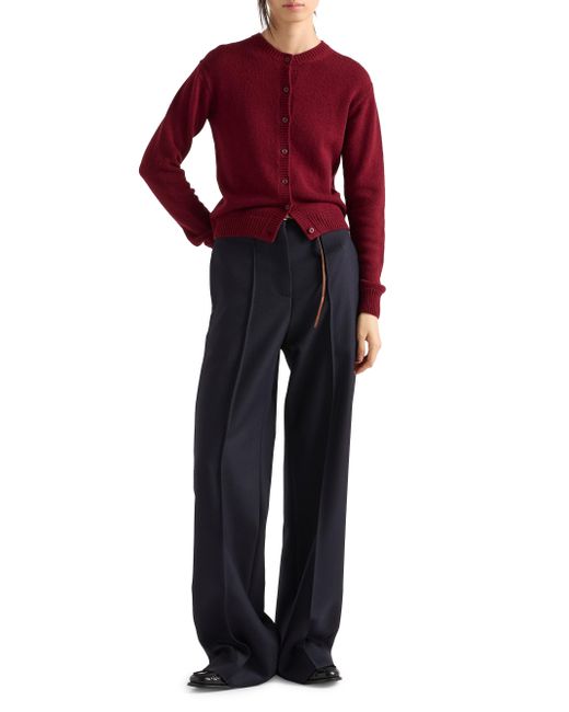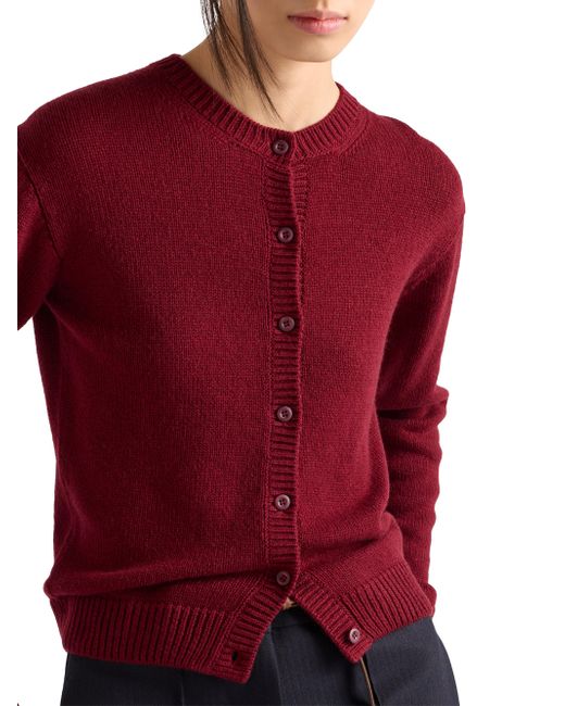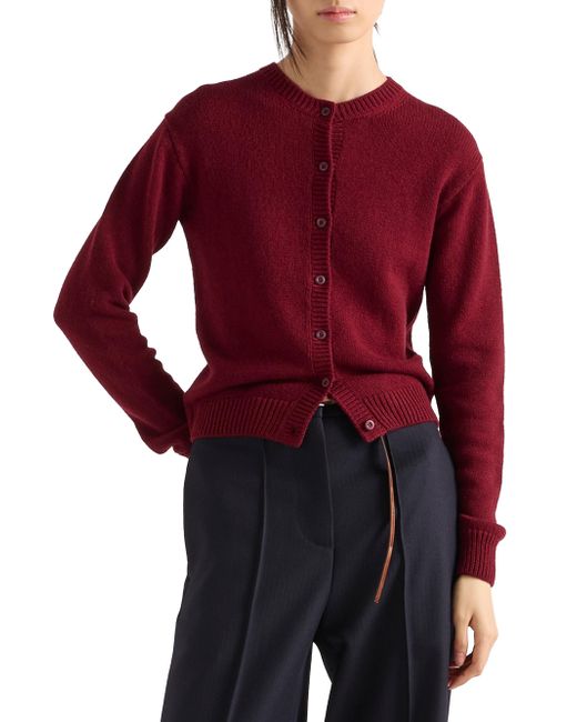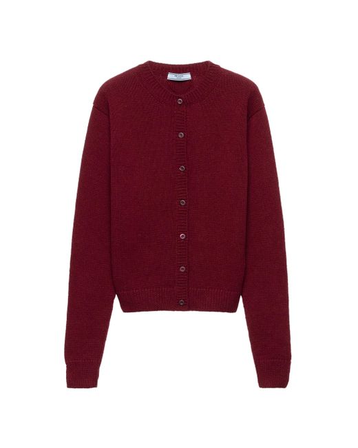 This soft cashmere cardigan features a classic boxy silhouette completed with sleek details such as the emblematic tonal knit triangle logo. Long sleeves Plain knit Boxy fit Ribbed knit crew neck Semi-raglan shoulder Ribbed knit cuffs and hem Knit triangle logo Front button closure 100% Cashmere - 100% Trochus Niloticus Made in Italy. Lsd Rtw - Prada Rtw > Prada > Saks Fifth Avenue. Prada. Color: Dark Red. Size: 2.