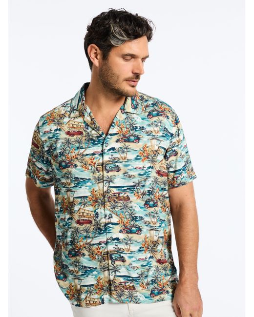 Chill beach getaway vibes go hand in hand with the light breathability of this viscose button down. The retro scene features vintage cars equipped with surfboards and boats coasting along the waves. Get ready to relax in this nostalgic style. Camp collar Full button front placket Retro beach print Contrast print at collar and sleeve Short sleeve Cuff at sleeve Straight hem 100% viscose Machine wash cold Imported