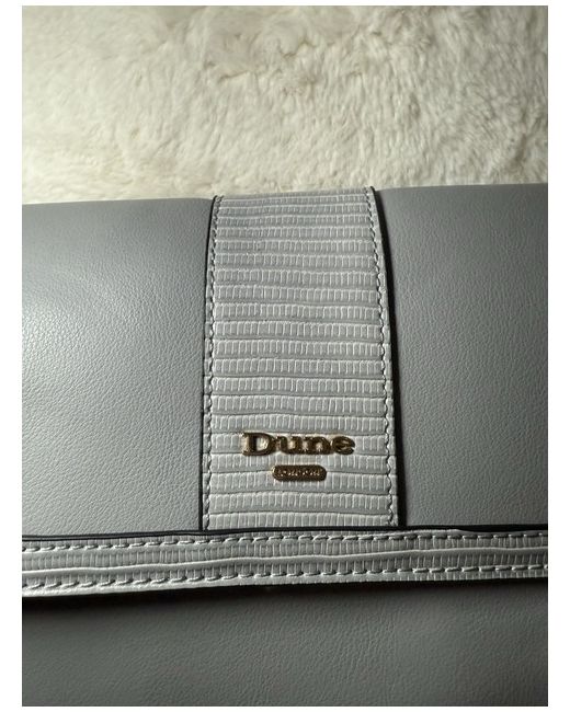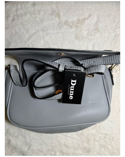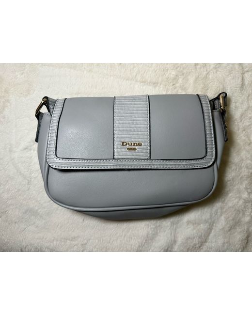 The Grey Dune Crossbody Bag is a stylish and practical accessory for women. This medium-sized bag features a zip closure and a black lining, with the signature Dune logo adding a touch of sophistication. Made from faux leather with leather accents, this versatile bag is perfect for everyday use. The chic grey exterior adds a modern touch to any outfit, making it a must-have for the fashion-forward woman on the go.