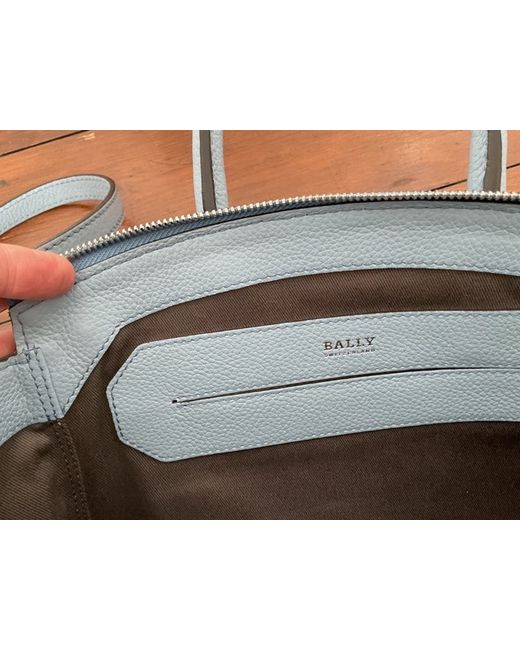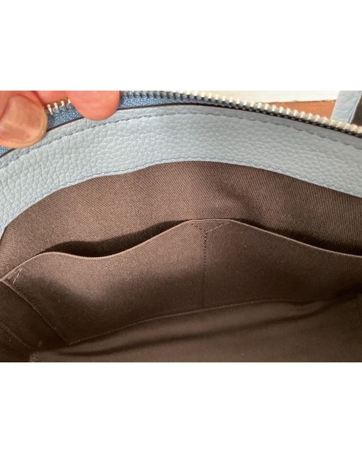 Made in Switzerland. The exterior is crafted from blue leather with silver hardware accents, while the interior is lined with dark black/brown canvas and includes inner and outer pockets for organisation.