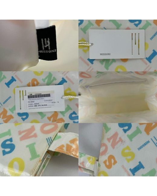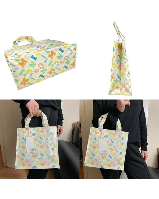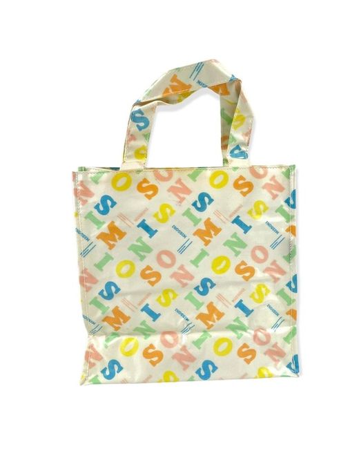 Off-white shiny PVC with colorful (pink, orange, blue, green, yellow) logo lettering pattern printed all over. White visible stitching. One inside pocket with zipper closure. Inside logo label.