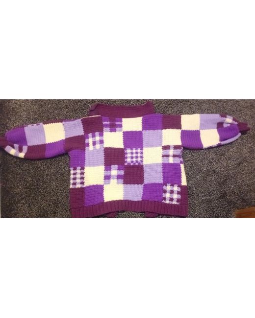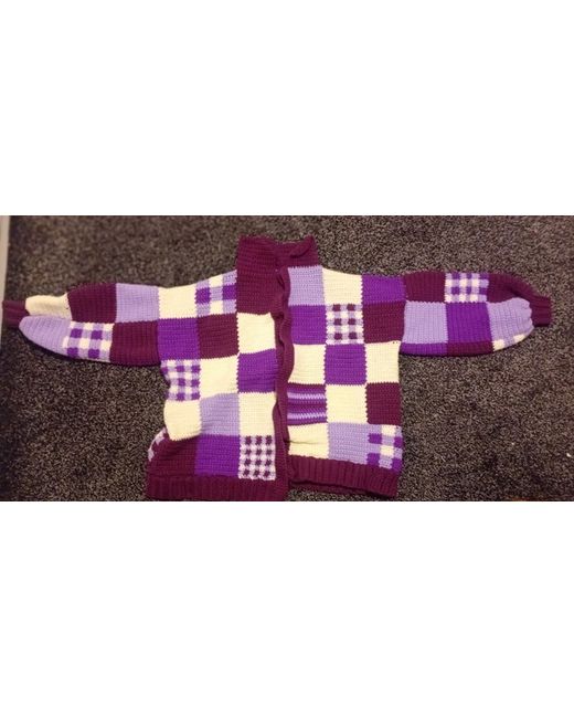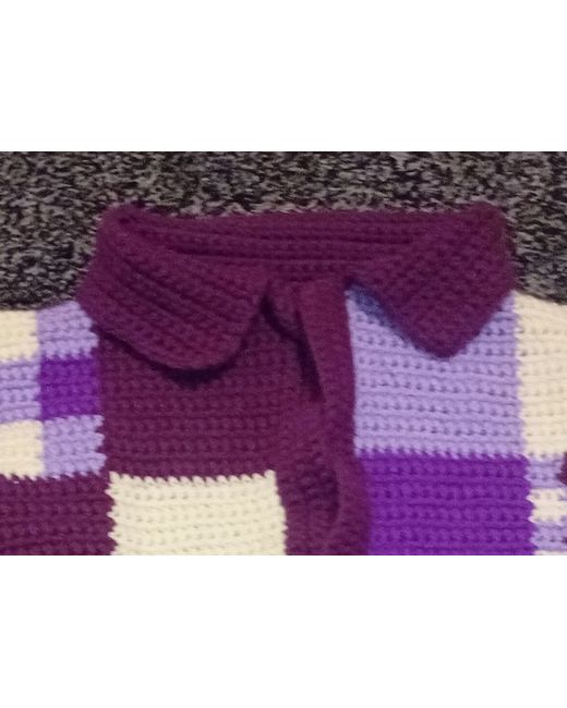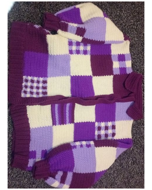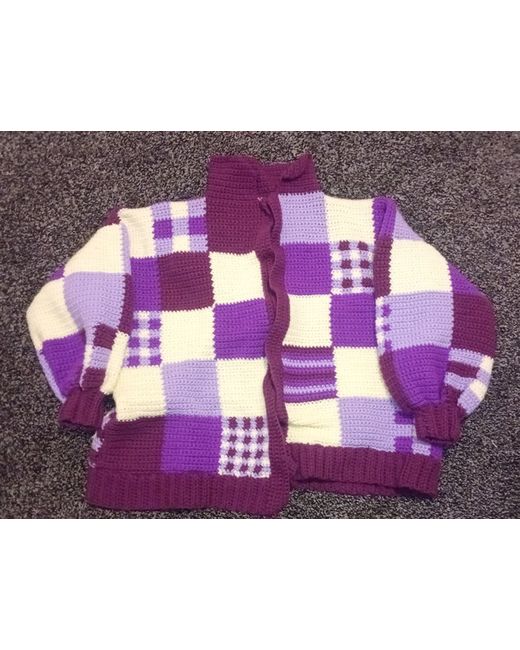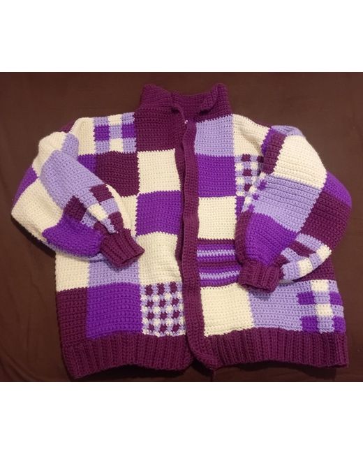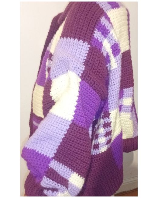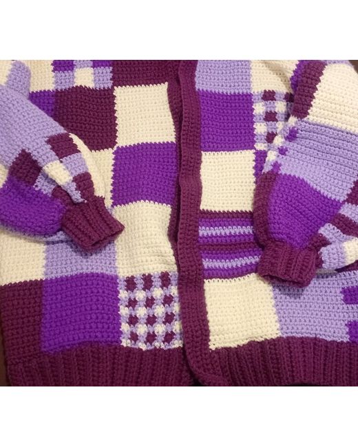 With this handmade crochet patchwork cardigan, the cardigan features a collared neckline, long balloon sleeves, and an open relaxed fit. The chunky-knit plaid pattern in shades of purple and beige is made of a blend of wool and acrylic, making it both comfortable and durable.