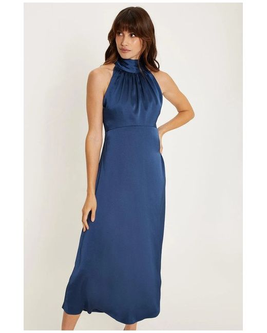 Women's Dark Blue Midi Dress Navy Satin Halterneck Sleeveless Elegant