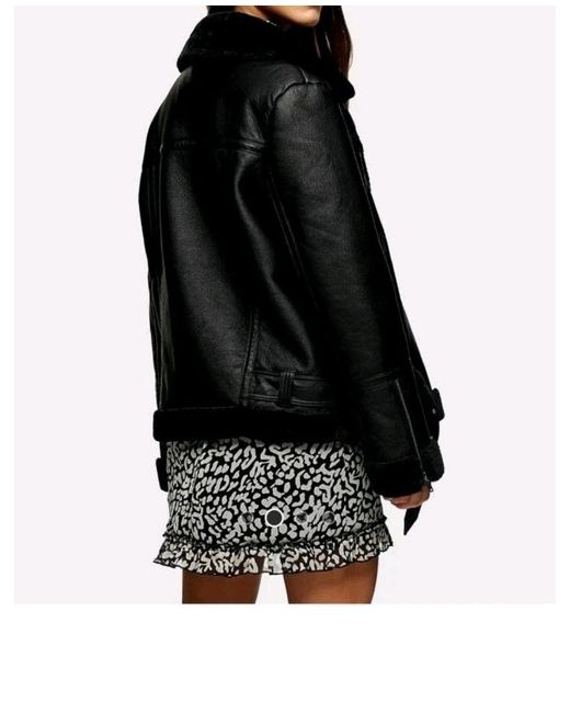 The Topshop Leather Jacket in black is a stylish and versatile option for women, featuring a biker-style design with a faux leather outer shell and shearling fabric type. With a full zip closure, oversized fit, and belted collar, this jacket is perfect for casual occasions in autumn, winter, or spring. The jacket also includes accents such as zip detailing, fur trim, and a buckle, adding a touch of flair to the overall look. Made with polyester insulation and faux fur lining, this mid-length jacket is designed for comfort and warmth, making it a must-have addition to any wardrobe.