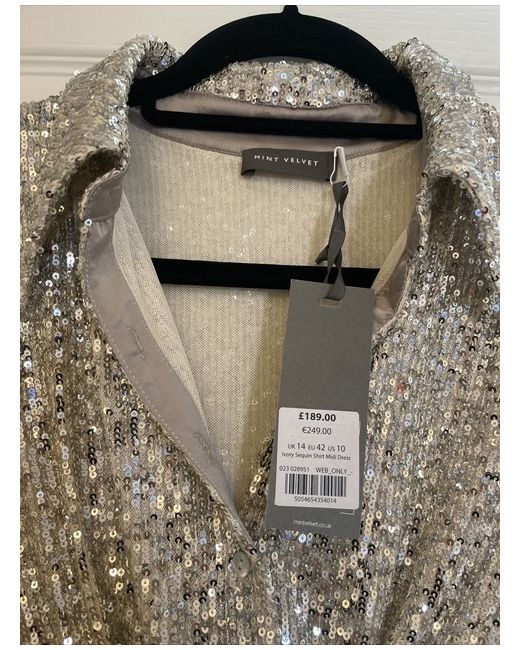 This Mint Velvet Sequin Maxi Dress in size 14 is a stunning gold / champagne gown perfect for parties The long length and sequin accents add a touch of glamour, making it a chic and elegant choice for any special occasion. Designed by Mint Velvet, this regular fit dress is a stylish addition to any woman's wardrobe, offering a luxurious and eye-catching silhouette that is sure to turn heads. this dress is a must-have for those looking to make a statement with their outfit. Cost £189