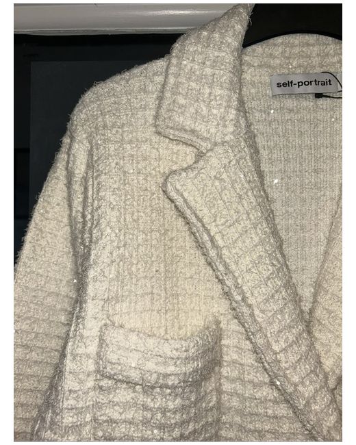 This Self-Portrait Cream Sequin Textured Knit Jacket is a stylish and versatile outerwear piece perfect for various occasions. The mid-length jacket features press button closure, a collared neckline, and a textured knit fabric with sequin accents, adding a touch of elegance.