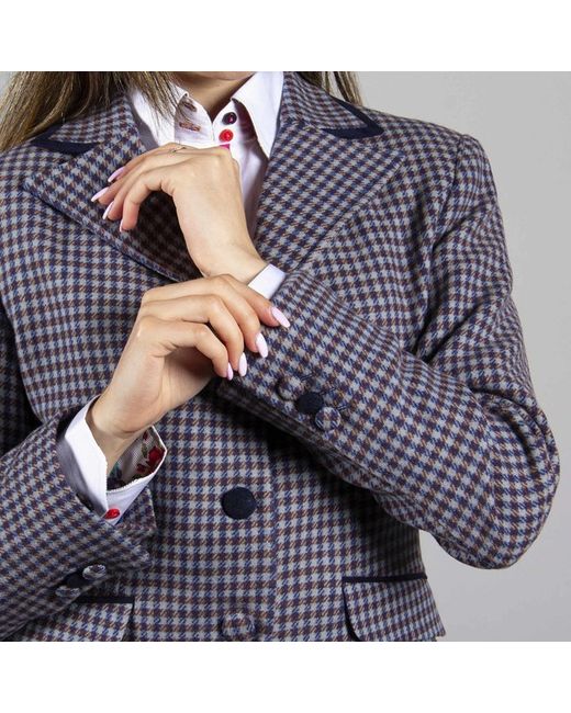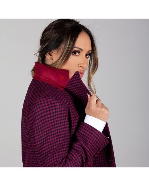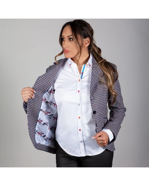 Stunning Dogtooth Jacket with horse dressage lining. Topped with lapel lining and vibrant, contrasting buttons. Half belt detail on the reverse.70% Wool 30% PolyDogtooth Exterior PrintHorse Dressage LiningContrasting ButtonsHalf Belt DetailModel Number: CLWJ62