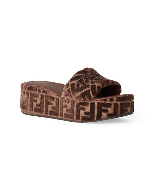 These Sunshine platform sandals from Fendi are crafted of velvet and feature an allover monogram pattern, rubber sole, and 60mm platform heel. Open toe Slips on Textile/cotton/other fibers Leather lining Rubber sole Made in Italy SIZE Platform heel: about 2.5" (60mm) ABOUT THE BRAND The epitome of elegance and fine craftsmanship, Fendi was founded in 1925 in Rome by Adele and Edoardo Fendi. Today, Creative Director Kim Jones continues the house's emphasis on quality, tradition, experimentation and creativity. Women's Shoes - Fendi Womens Shoes > Fendi > Saks Fifth Avenue. Fendi. Color: Beige Chocolate. Size: 5.