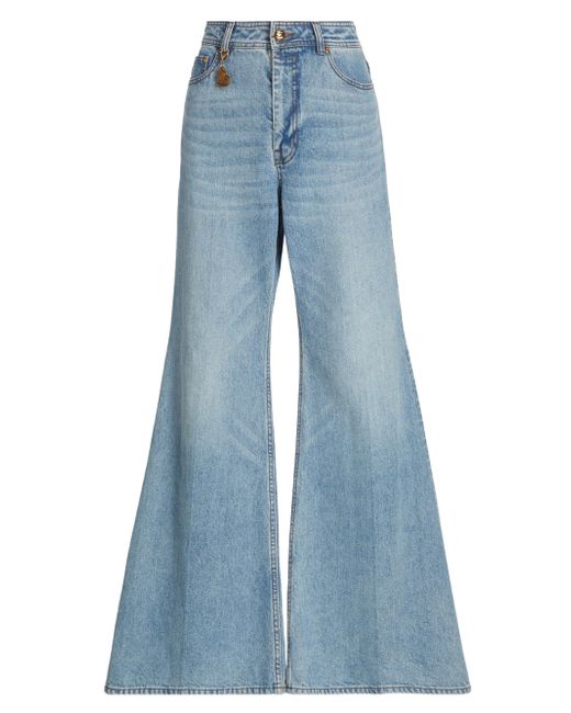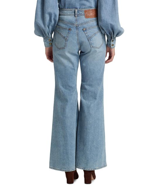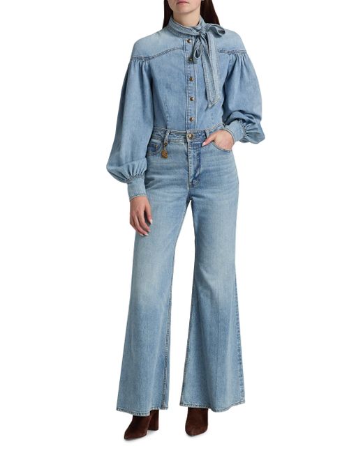 Zimmermann's flare jeans are crafted of washed stretch denim. Cut with a high-rise waist, they flow into a wide, flared leg. Five-pocket style Concealed zip fly, button closure 99% cotton/1% elastane Machine wash Imported SIZE & FIT Rise: about 12" Inseam: about 31" Model measurements: 5'10" tall Model is wearing a US size 4 ABOUT THE BRAND Australian founders and sister-duo Nicky and Simone Zimmermann design with a signature feminine aesthetic, each piece rife with tiers of fabric, rich embroidery and splashy prints. From ruffled bikinis and beachwear to luxe, intricately patterned maxi (and mini) dresses, everything is overtly romantic in the most elevated, effortless way. Contemporary Sportswear - Zimmermann > Zimmermann > Saks Fifth Avenue. Zimmermann. Color: Dawn Blue. Size: 24.