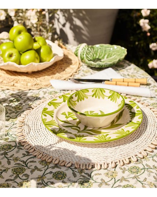 An elegant addition to your tablescape, Maison Margaux's Green Petals tablecloth evokes the ambience of an al fresco dinner even when used indoors. The intricate pattern is block-printed by master artisans onto pure cotton, with intertwined green, pastel yellow and blue florals making it suitable for year-round use.