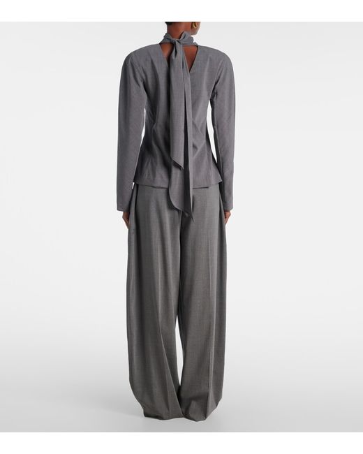 Material: 98% wool, 2% elastane. Care instructions: dry clean. Made in Bulgaria. Designer color name: Grey. Item color: gray. Closure: self-ties. Shoulder pads. Self-tie neck. Wool.
