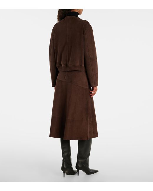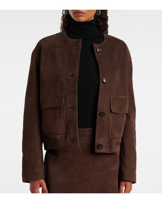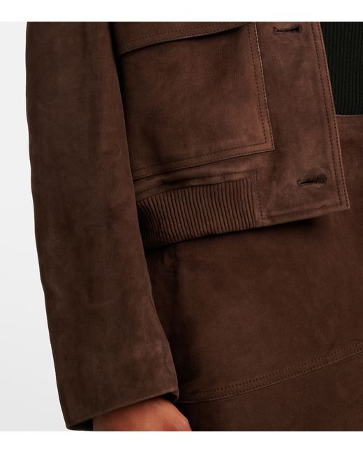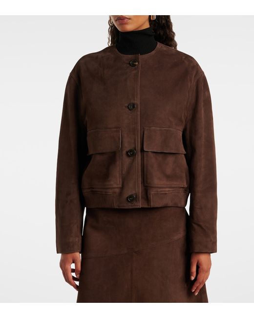 Material: 100% lamb leather (suede). Care instructions: specialist clean. Made in France. Designer color name: Cacao. Item color: brown. Lining: 57% viscose, 43% polybutylene terephthalate. Closure: buttoned front. Pockets: flap pockets. Hem: ribbed, elasticated. Fully lined. Leather.