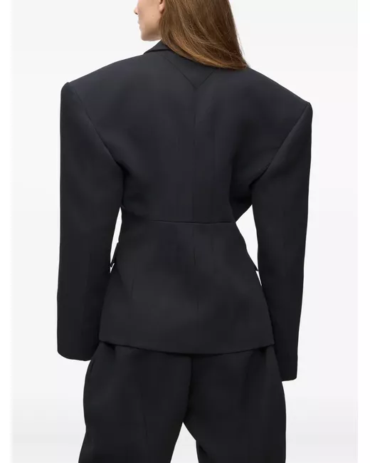 black wool front button fastening notched lapels long sleeves v-neck side flap pockets