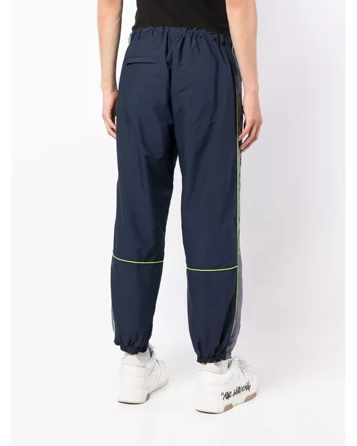 navy blue cotton lightweight construction panelled design check pattern logo print to the side elasticated ankles elasticated waistband