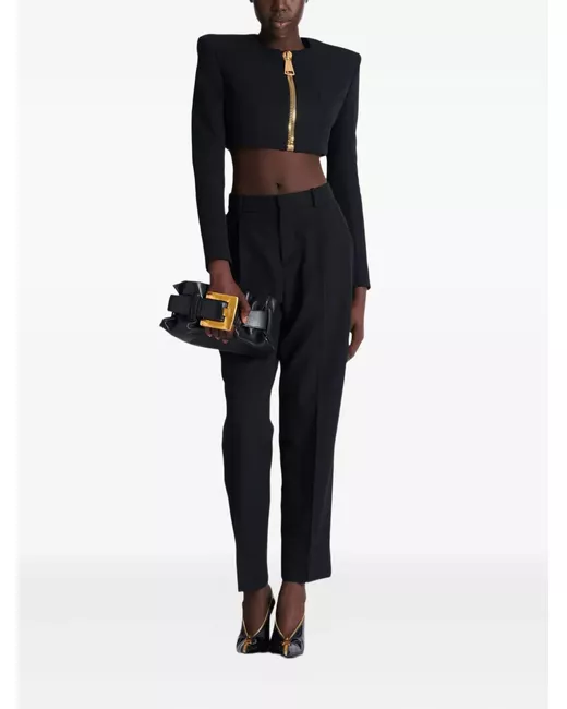 black padded shoulders central zip fastening long sleeves zip cuffs welt pocket