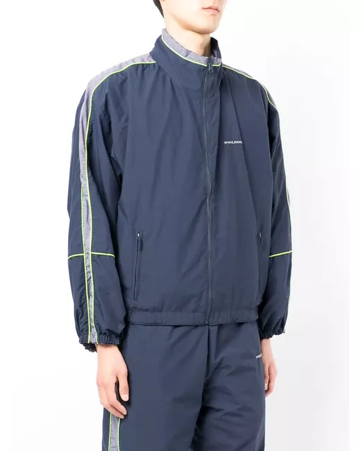 navy blue cotton lightweight construction panelled design check pattern high neck front zip fastening long sleeves logo print at the chest
