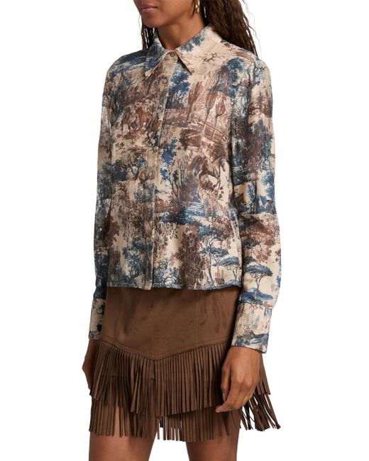 Crafted of a Western-printed lace, the Maia blouse from L'AGENCE features a tailored button-front design. Spread collar Long sleeves, button cuffs Button-front closure 68% nylon/32% cotton Lining: 100% polyester Dry clean Imported SIZE & FIT About 25" from shoulder to hem Model measurements: 5'10" tall Model is wearing a US size Small ABOUT THE BRAND Founded in 2008, L'Agence marries Southern California ease with chic Parisian style. Using luxurious fabrics, the Los Angeles-based label delivers feminine collections that are both timeless and versatile. In 2015, the label launched a denim line in a range of sleek, impeccably tailored cuts. Contemporary Sportswear - Workshop > L'agence > Saks Fifth Avenue. L'AGENCE. Color: Tan Multi Western Toile. Size: XXS.