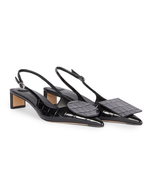 These Les Slingbacks Duelo pumps from Jacquemus, crafted of crocodile-embossed leather, feature a circle and square detail. The pair is designed with a pointed toe and 40mm kitten heel. Point toe Buckle closure Leather upper Leather lining Leather sole Made in Italy SIZE Kitten heel: about 1.5" (40mm). Women's Shoes - Advanced Women's Designe > Jacquemus > Saks Fifth Avenue. Jacquemus. Color: Black. Size: 7.