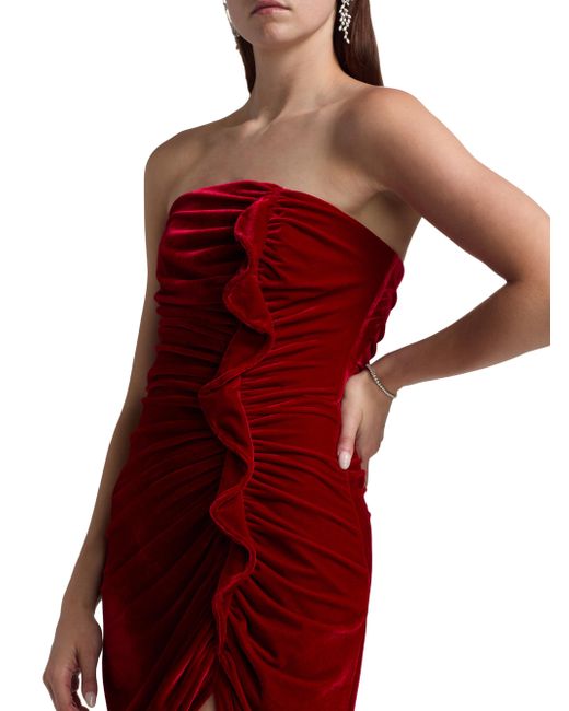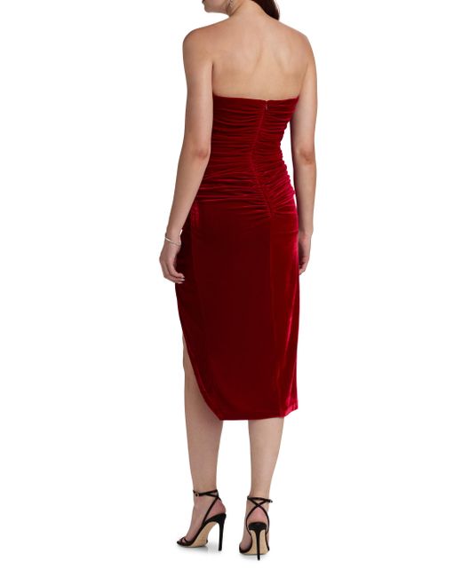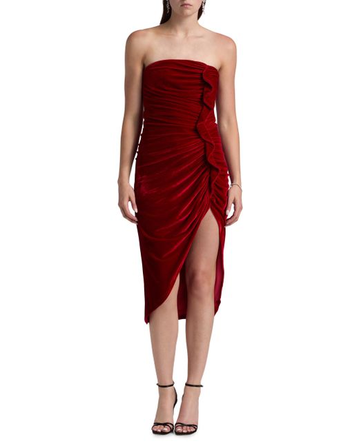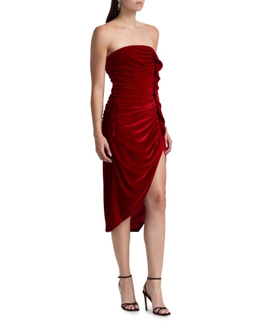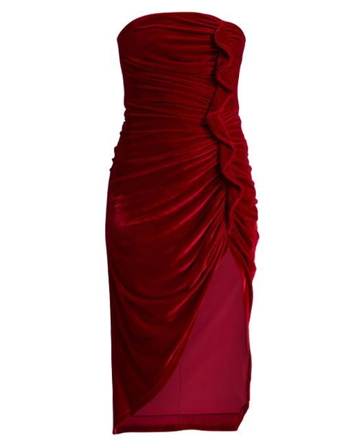 This ruched minidress from BCBGMAXAZRIA is crafted of velvet and features a strapless design with a ruffled overlay and an asymmetric front cut. Strapless Concealed back zip closure 95% polyester/5% spandex Dry clean Imported SIZE & FIT About 47" from shoulder to hem Model measurements: 5'10" tall Model is wearing a US size 4. Dress Collections - Bcbg > Bcbgmaxazria > Saks Fifth Avenue. BCBGMAXAZRIA. Color: Chilli Pepper. Size: 0.