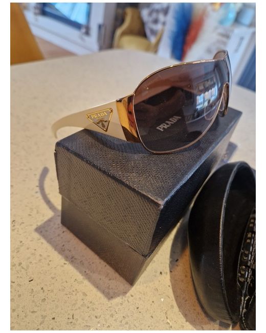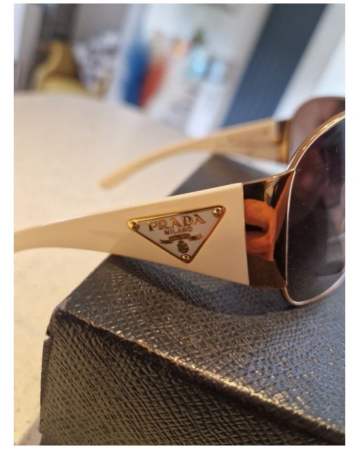 These PRADA sunglasses are a designer accessory for both men and women, featuring a stylish round design with a frame colour of white and gold. Made in Italy, they offer UV400 protection and are crafted with high-quality plastic lenses. The sleek and elegant design of these sunglasses exudes luxury and sophistication, making them a perfect choice for those seeking a chic and fashionable eyewear option.